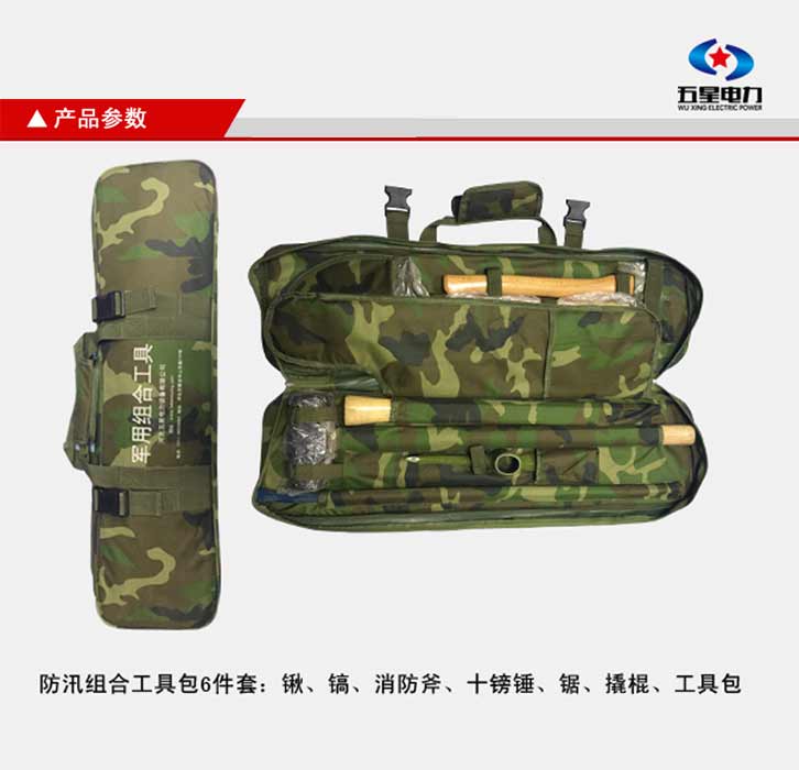 防汛組合工具包六件套:鍬、鎬、消防斧、十磅錘、鋸、撬棍、兩節(jié)連接桿、工具包。一柄多用,適用于消防隊(duì)員使用