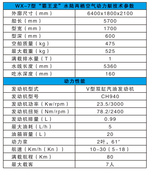 河北五星“霸王龍”水陸兩棲空氣動力艇是一種運用空氣動力學、采用航空發動機和空氣螺旋槳推動,通過置于船體上部的大功率內燃機帶動碳纖維螺旋槳產生空氣動力的多地形交通工具。所搭載的航空發動機動力系統強勁,功率可達300馬力以上,螺旋槳推力可達500公斤以上,操縱機動靈活,靜水巡航速度可達40km/h,可以高時速可達70km--120km/h。